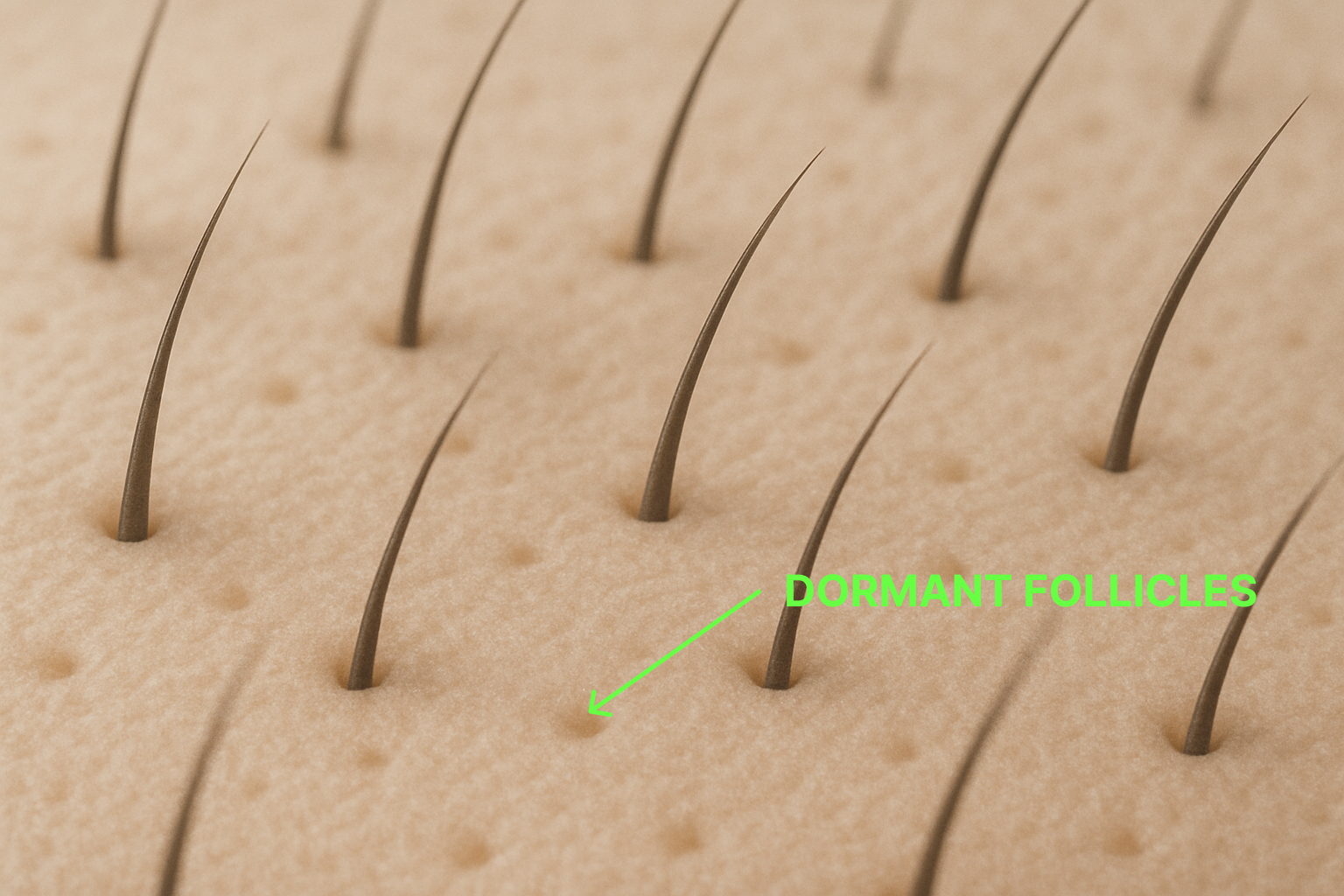 As hair follicles shrink over time, they may stop producing visible hair — but this doesn’t necessarily mean they’re permanently inactive. Research shows that many follicles can remain dormant for years, retaining the potential to be reactivated under the right conditions.