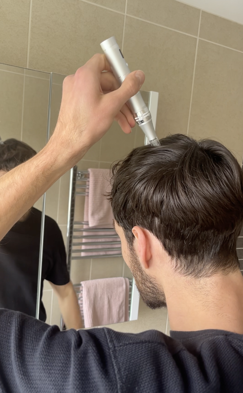 Microneedling is a type of treatment to help regeneration. In this case, to attempt to reactive miniaturising hair follicles by using the Olapen to create tiny microscopic microchannels to the scalp.