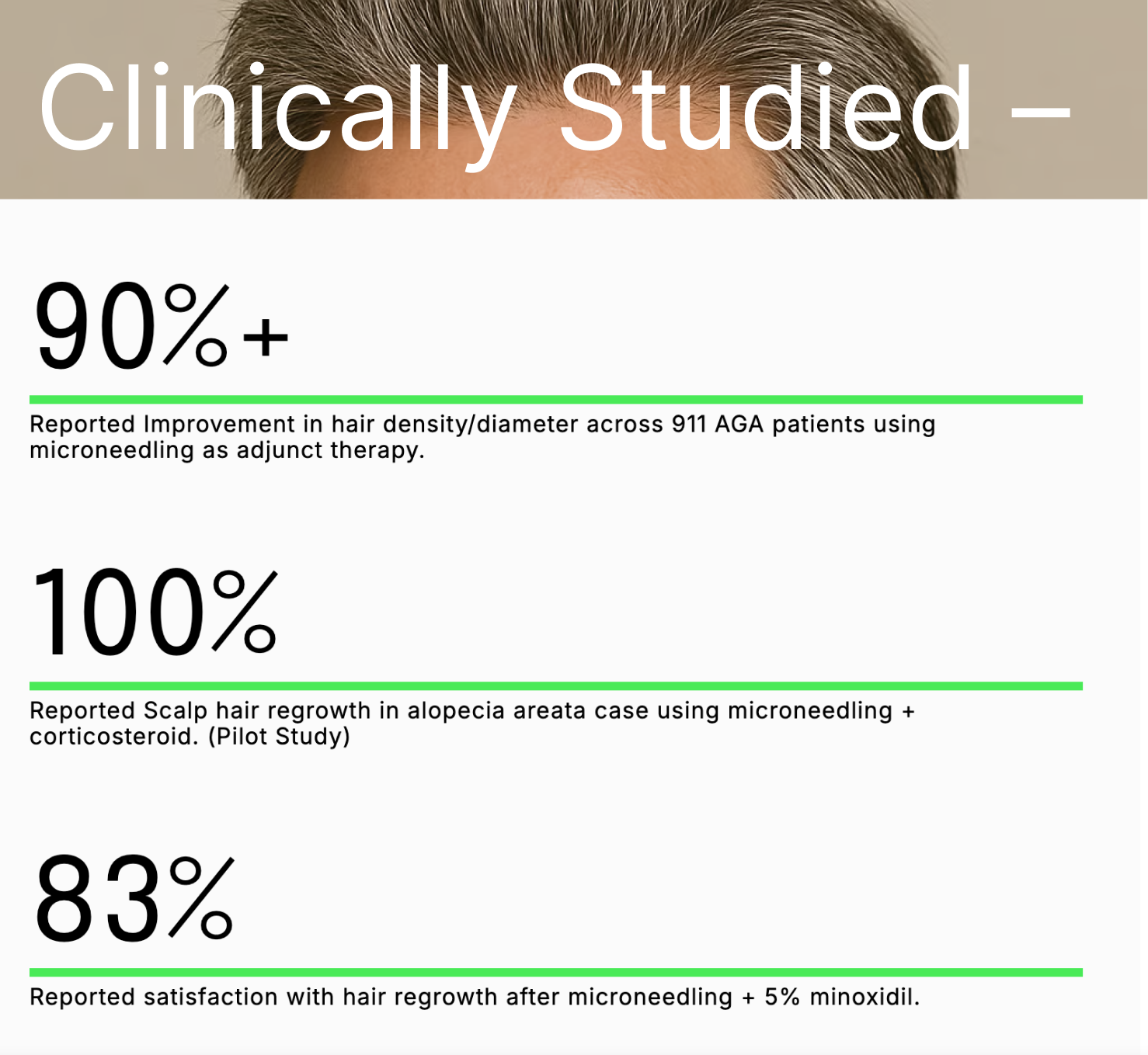 3. Fabbrocini G, Villani A, Potestio L, Scalvenzi M. Microneedling in Androgenetic Alopecia: Experimental Approaches and Clinical Results. J Clin Med. 2022;11(8):2144. https://www.mdpi.com/2077-0383/11/8/2144