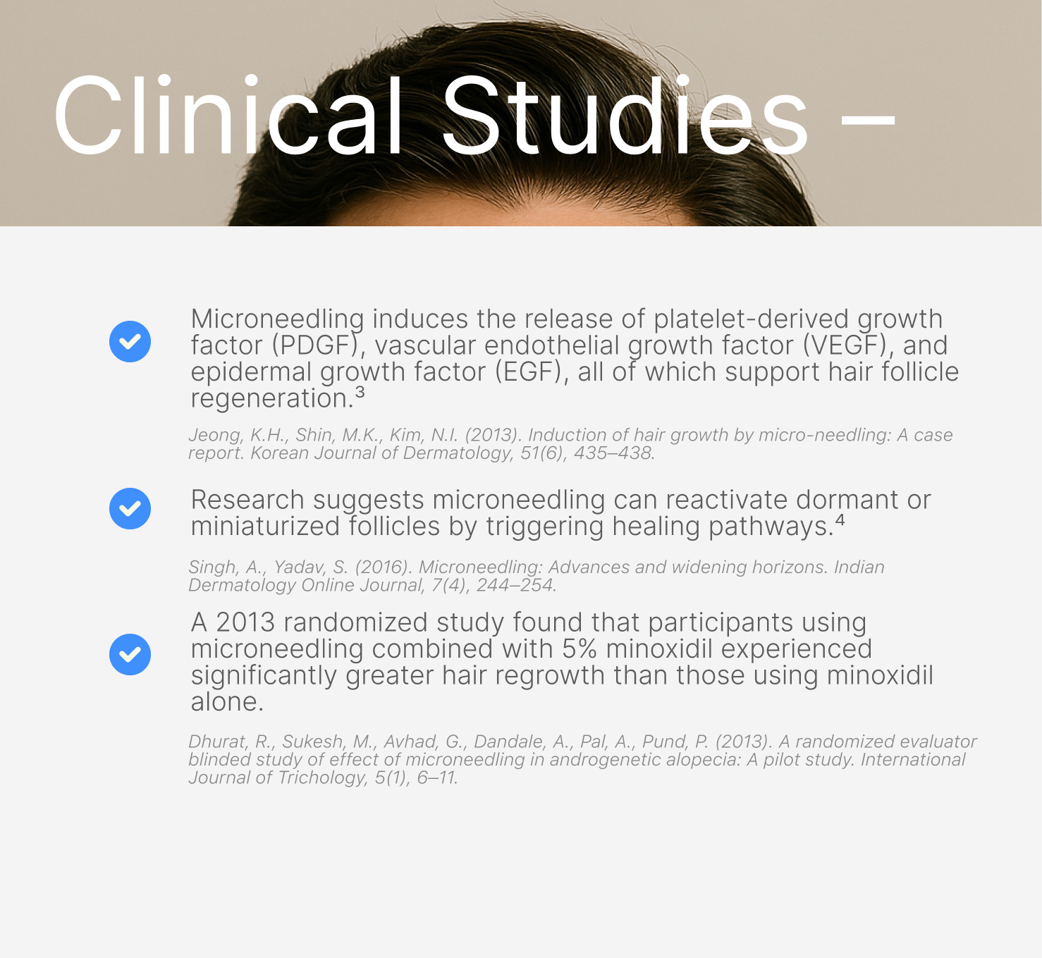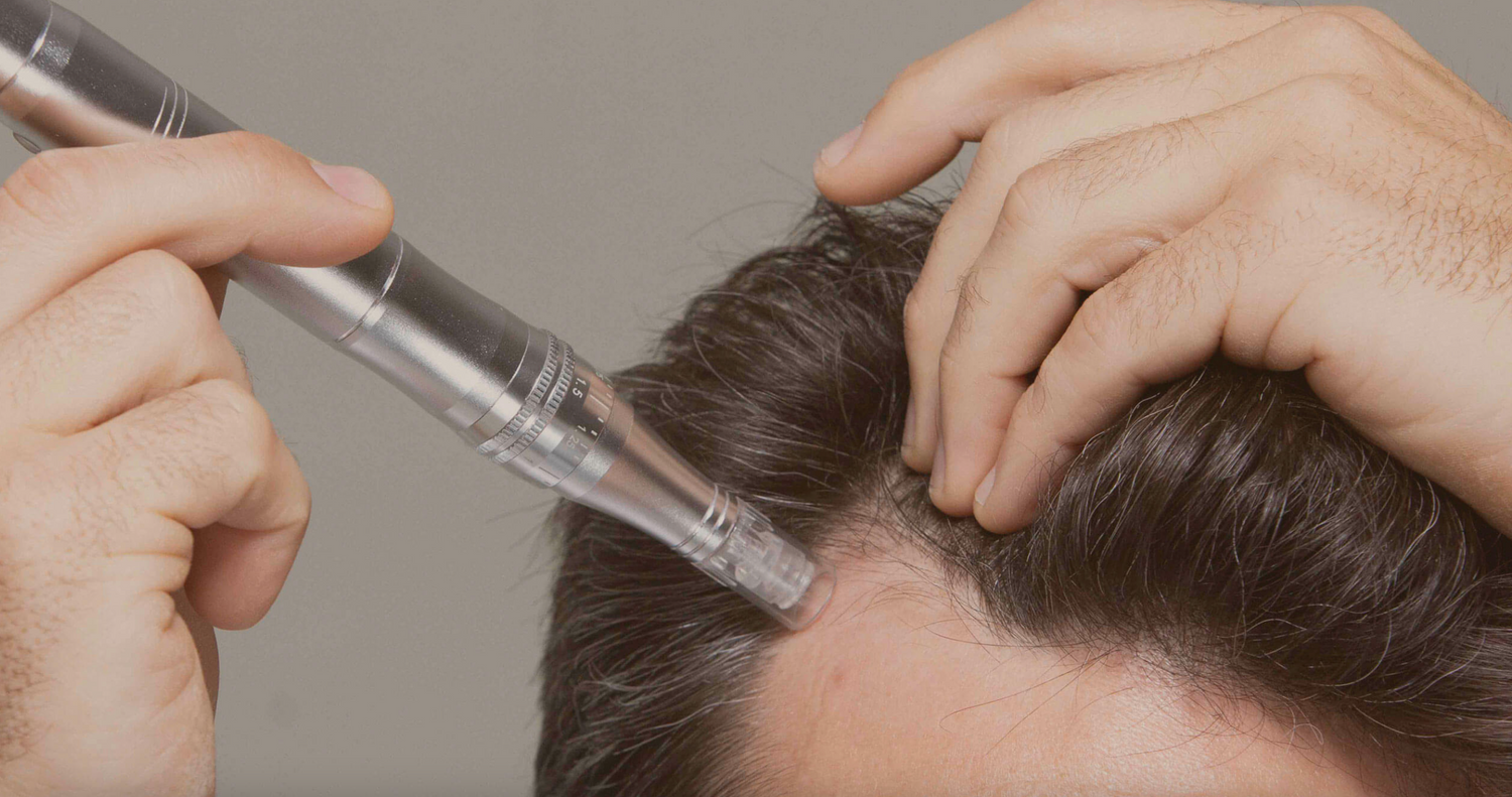 Microneedling is a minimally invasive procedure for your hair loss. Using thin, micro needles to make tiny holes in the top layer of your scalp. The damage helps stimulate your skin's healing process, so it produces more growth factors, promotes follicle blood flow to kickstart growth in weakening follicles.